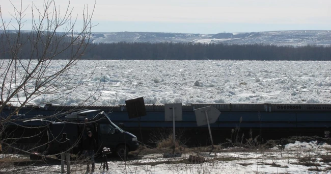 La km 304+500 pe malul drept s-a prins în gheaţă un împingător sub