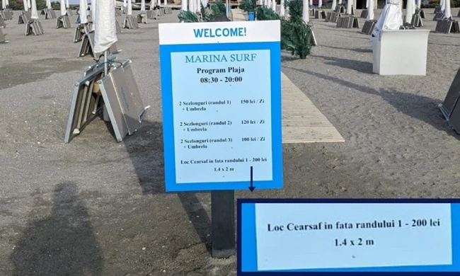 Conform tarifelor afişate la intrarea pe plaja închiriată de cei de la Marina Surf, dacă cineva doreşte să stea cu un cearşaf de 1,4 x 2 metri în faţa primului rând de şezlonguri trebuie să scoată din buzunar 200 de lei pe zi. Pentru două şezlonguri, pe aceeaşi plajă, este percepută o taxă cuprinsă între 100 şi 150 de lei, în funcţie de poziţionarea acestora.