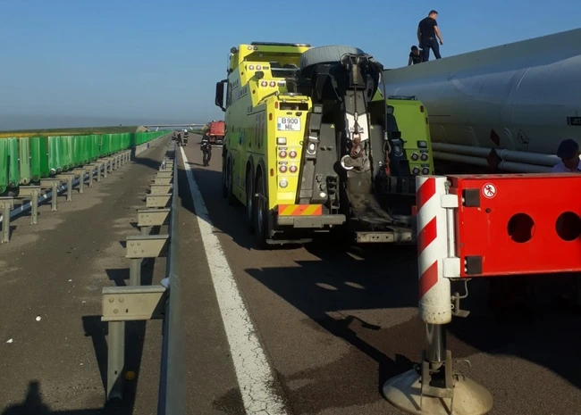 „Precizăm că o macara pusă la dispoziţie de către CNAIR a repus pe roţi cisterna răsturnată, iar la această oră se desfăşoară operaţiunea de transfer a combustibilului din cisterna implicată în incident în alte două cisterne.