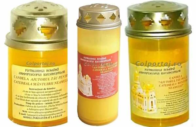 Candela de cult tip 1 (foto stânga) costă doar 3 lei şi are un timp de ardere de aproximativ 16 ore. Este marcă înregistrată la OSIM, iar de producerea ei se ocupă Fabrica de lumânări „Făclia Sfinţilor Români”.