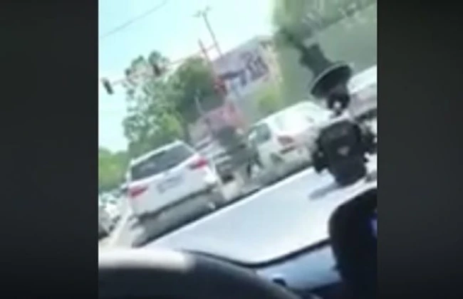 Incidentul a fost filmat de un alt şofer care stătea la semafor. Din imagini se vede cum conducătorul auto agresor îi aplică celuilalt şofer mai multe lovituri cu picioarele şi pumnii.