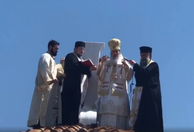 VIDEO Spectacol făcut de Teodosie la sfinţirea crucilor de pe biserica de la Dervent. Arhiepiscopul s-a cocoţat pe turlă