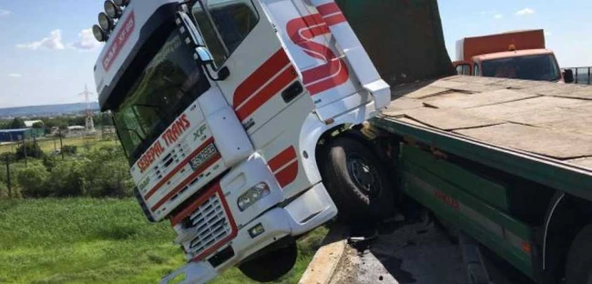Un bărbat în vârstă de 49 de ani, din Caraş Severin, a rămas cu TIR-ul suspendat pe un parapet de pe marginea drumului naţional.