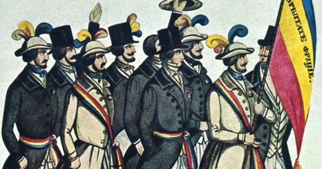Tricolorul din 1848, cu menţiunile "Dreptate, Frăţie". Acuarelă de C. Petrescu Sursa Wikipedia. La vremea respectivă, culorile tricolorului erau orientate succesiv pe cotor, cu roşu în partea inferioară şi albastru în partea superioară