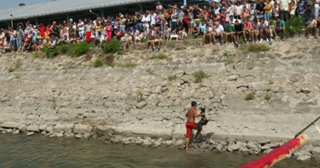 Au urmat cele două runde de sărit cu sacul de rafie, stropite la final tot cu licorile lui Bachus. Aruncarea raţelor în apă a adus la start mai mulţi concurenţi, care s-au ales la sfârşit cu câte două-trei păsări, dar doar după ce au făcut o baie zdravănă în Dunăre, înotând minute bune după orătănii. După ce raţele au fost „dovedite” de concurenţi, a urmat proba de echilibristică pe bârna unsă, la capătul căreia se afla un steag alb.