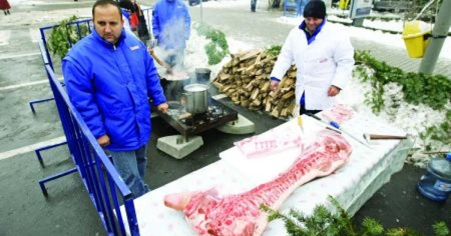 Bucătari şi măcelari iscusiţidin trei firme craiovene au tranşat porcul în plin centrul oraşului, sub nasul primăriei, şi l-au transformat în bucate şi produse tradiţionale, respectând reţete bătrâneşti.