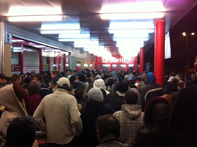 Îmbiați de ofertele anunțate de hipermarket, sute de craioveni au decis să înfrunte frigul tăios și să vină la cumpărături între orele 23.00 și 3.00, când au fost anunțate prețuri speciale și oferte la multe dintre produsele de la raft. În jurul orei 23.00, zona din jurul magazinului de pe Calea București era aproape blocată de mașinile care se îndreptau spre parcarea Kaufland. Din cauza numărului mare de oameni care doreau să intre în magazin, forțele de ordine au apelat la ajutorul mai multor echipaje de poliție. Asta nu i-a împiedicat însă pe cei care se luptaseră să obțină un cărucior să încerce să forțeze intrarea, alegându-se cu diverse apelative din partea agenților de pază. “Dacă erai șmecher nu veneai ca milogul aici”, i-a strigat un agent unui craiovean care a încercat să intre în magazin prin forță.