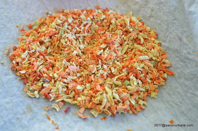 Toate legumele şi verdeaţa le punem într-un bol şi adăugăm sare grunjoasă neiodată, după gust. Apoi aşezăm ingredientele pe plasa de ţânţari şi le acoperim cu tifon sau cu plasa de protecţie. Astfel, suntem siguri că nici nu se strâng musculiţe şi nici nu intră praf. Se lasă suportul cu legume la soare. Două, trei zile. Important este ca peste noapte să băgam cadrul în casă, în garaj, într-un loc unde să nu cadă roua. La final, punem toate legumele într-o tavă de cuptor, pe o hârtie de copt. Lăsăm la foc foarte mic, cu uşa întredeschisă doar câteva minute, să fim siguri că totul este foarte bine uscat. Ultimul pas este să punem totul într-un robot şi să mixăm. Vom obţine un praf pe care-l vom pune în caserole mici din plastic. Acestea se vor ţine la congelator şi ori de câte ori vom avea nevoie, vom folosi vegeta astfel obţinută la orice mâncare dorim să o facem.
