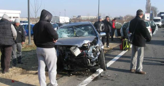Patru autoturisme au fost distruse în urma unui accident, iar două persoane au ajuns la spital. Nicuşor Daniel Dragoş, de 39 de ani, din Craiova, s-a urcat la volanul autoturismului Chevrolet Aveo, iar când a încercat să iasă din parcarea Aeroportului nu s-a asigurat şi a intrat direct într-o autospecială marca Iveco. Impactul a fost atât de puternic încât Chevroletul a fost proiectat pe contrasens, unde a lovit alte două maşini.