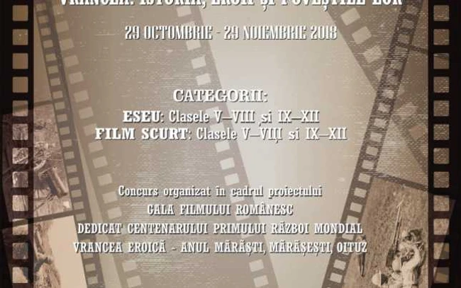 0Consiliul Judeţean Vrancea şi Biblioteca Judeţeană Duiliu Zamfirescu Vrancea derulează, în perioada 29 octombrie – 10 decembrie 2018, proiectul ”Gala Filmului Românesc Dedicat Centenarului Primului Război Mondial - Vrancea Eroică - Anul Mărăşti, Mărăşeşti, Oituz”.