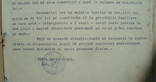 “Din verificările efectuate de către noi rezultă că în urmă cu patru ani a cumpărat o maşină marca Fiat 1500 cu suma de 45.000 de lei şi şi-a cumpărat o casă în valoare de circa 50.000 delei. Susnumitul are un salariu tarifar de circa 1200 de lei, soţia sa de 900 de lei şi considerăm că la greuţăţile familiale pe care le-a avut, întreţinerea a doi copii, nu-şi putea procura o maşină proprietate personală şi nu putea construi şi casă”, se arată în adresa Miliţiei către comisia de cercetări privind controlul unor bunuri care au fost dobândite în mod ilicit a Tribunalului Vrancea, la sesizarea unui “binevoitor”.