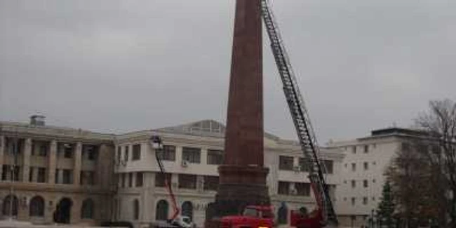 În cursul zilei de astăzi, lucrătorii de la Direcţia de Dezvoltare lucrau la împodobirea centrului civic, aceştia apelând şi la o macaraua pompierilor pentru a monta o instalaţie în vârful obeliscului din Piaţa Unirii.