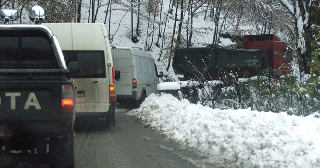 Ninge abundent în Munţii Vrancei. Un camion neechipat de iarnă a blocat circulaţia pe Ojdula