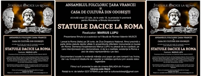 ”Istoria României începe la Roma! Documentarul ”Statuile dacice la Roma”, realizator Marius Lupu, premiera pentru România, vineri, 22 iulie, la orele 18, la sala ”Balada” din Focşani. Vă invităm la o introducere în geneza poporului român, printr-un documentar realizat de un focşănean autodidact şi cu suflet mare! Intrarea este liberă. Vă rugăm invitaţi pe toţi cei dragi şi nu uitaţi că actul de identitate al poporului român se află pe Columna lui Traian, la Roma!”, scrie pe afişul filmului.