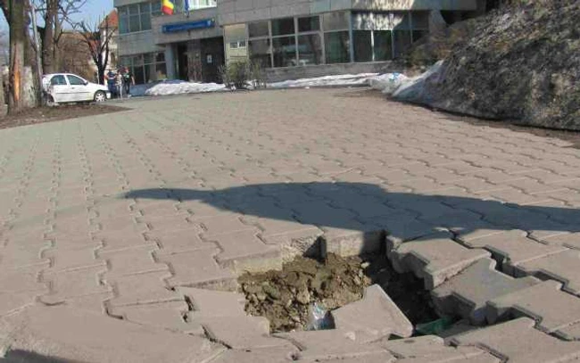 0În mai multe zone din municipiu, s-au format adevărate gropi în trotuarele pavelate recent. Edilii spun că acest lucru se datorează beciurilor care împânzesc la tot pasul oraşul.