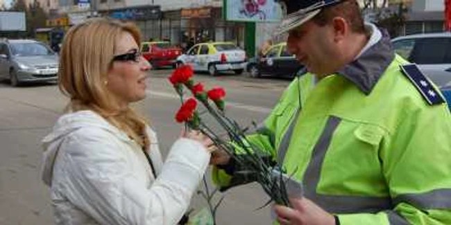 Aproape toate şoferiţele care au trecut azi dimineaţă prin zona Comisariatului, pe Bulevardul Unirii au fost oprite de poliţiştii rutieri pentru a primi o floare şi o felicitare. „Să aveţi o primăvară frumoasă şi fără evenimente rutiere", le-au urat poliţiştii doamnelor şi domnişoarelor aflate la volan. Pentru unele dintre ele, gestul a fost o mare surpriză. "Nu mă aşteptam, eu circulam fără centură şi am crezut că de asta m-a oprit. Când am văzut florile, mi-am revenit", a spus una dintre doamnele oprite în trafic. Acţiunea s-a desfăşurat şi în alte zone ale municipiului, unde oamenii legii au oferit flori şoferiţelor.