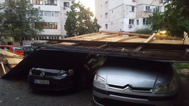 O furtună care a durat doar 10-15 minute a creat probleme în oraşul Galaţi. Acoperişul unui bloc cu opt etaje, de pe strada Oţelarilor, din cartierul Micro 21, a fost luat de vânt şi s-a prăbuşit peste autoturismele parcate în zonă.La faţa locului intervine o autospecială de la Detaşamentul de Pompieri Galaţi - ISU Galaţi. Speriaţi de zgomot, locatarii au ieşit din clădire. Din fericire, nimeni nu a fost rănit.