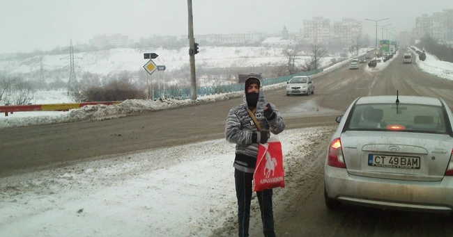 "Stau aici de la ora 8.00 dimineața. Stau cât pot în intersecție, îmi mai iau un ceai sau o cafea. Lumea mă vede că mi-e frig și îmi mai da un ban, ceva de mâncare. Șoferii de tir sunt mai darnici. Le spun că mi-e frig, că nu am cu ce să îmi iau de mâncare și mă capăt cu una alta. Fac și câte 500 de mii la zi", ne-a spus unul dintre cerșetorii care își fac veacul la semaforul de la ieșirea din Galați, spre Brăila.