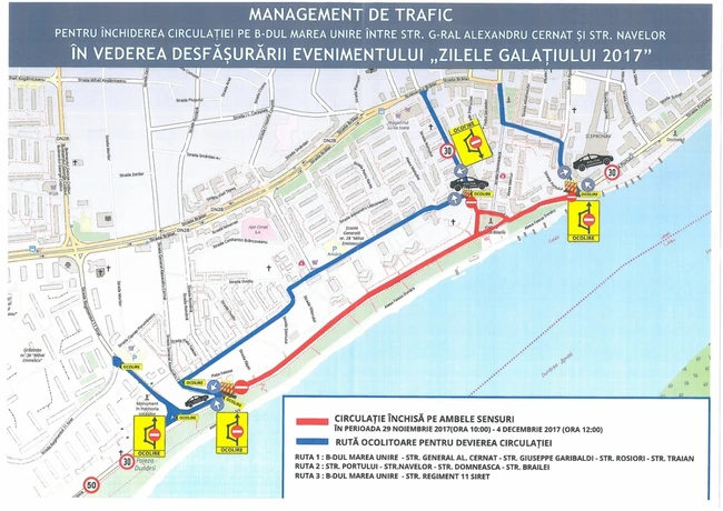 Circulaţie închisă, în perioada 29 noiembrie–4 decembrie, pe bulevardul Marea Unire din Galaţi