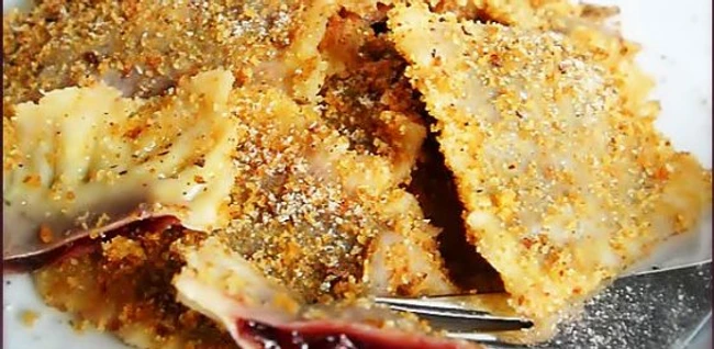 Scoatem colţunaşii din vasul cu apă cu ajutorul unei spumiere şi îi punem în vasul cu unt şi rom, tăvălindu-i apoi în pesmetul cu miez de nucă. Aşezăm colţunaşii estetic pe o farfurie şi îi putem servi calzi.