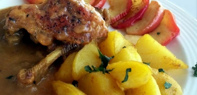 Vom scoate apoi carnea pe un platou, iar merele care s-au sotat în tigaie le vom strecura printr-o sită, peste care vom pune două linguri de smântână şi vom amesteca, astfel încât să obţinem un sos extrem de gustos.