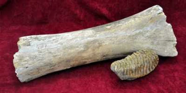0Exponatul constă în două fragmente fosilizate de mamut lânos (Mammuthus primigenius), respectiv un fragment fosilizat de molar şi unul de femur.