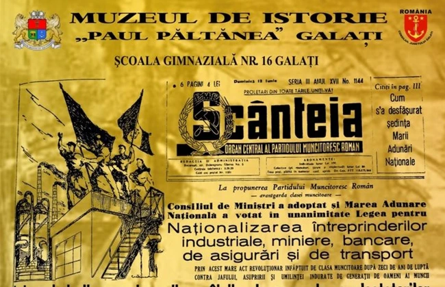 Muzeul de Istorie „Paul Păltănea” din Galaţi, în parteneriat cu Şcoala Gimnazială nr. 16 Galaţi invită publicul miercuri, 17 iunie 2015, de la ora 11,00, la expunerea cu tema „Naţionalizarea din 11 iunie 1948” , susţinută de muzeograful Valentin Bodea.