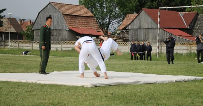 60 de jandarmi din toată ţara s-au strâns pentru două săptămâni la Gheorghieni pentru a participa la un stagiu de pregătire în domeniul artelor marţiale. Ieri, aceştia s-au strâns cu toţii în curtea centrului unde a avut loc pregătirea la ceremonia de încheiere a cursurilor, la care a participat şi un colonel superior din cadrul Trupelor Poliţiei Înarmate Populare Chineze.