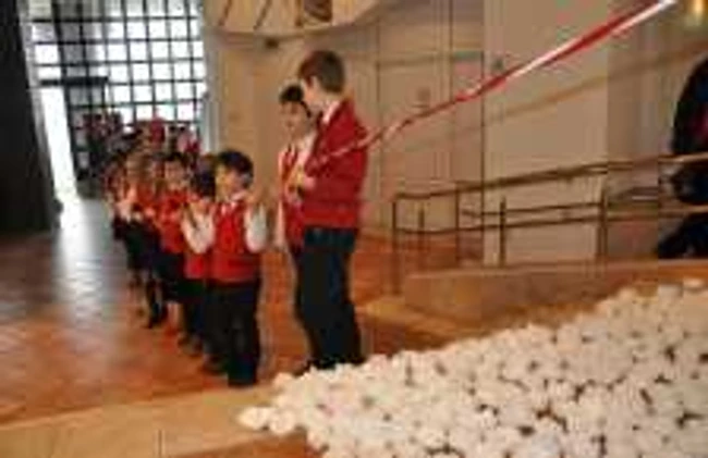 Mărţişor gigant la Galaţi: are 100 de metri. Copiii au umplut parterul şi primul etaj al unui muzeu cu panglici roşii şi albe