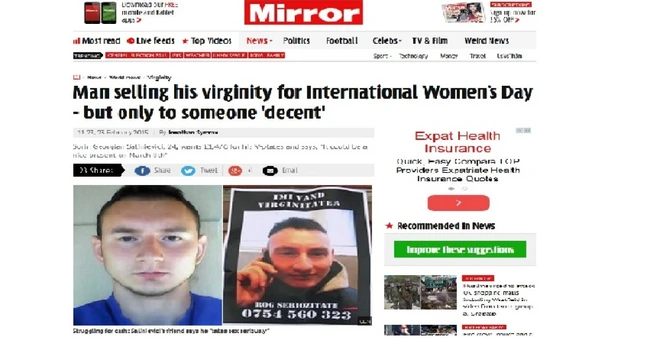 Povestea tânărului din Galaţi care vrea să-şi vândă virginitatea pentru suma de 2.000 de euro are ecouri şi în presa internaţională. Celebrul cotidian britanic „Mirror“, în ediţia sa online de astăzi, pune pe tapet scurta, ciudata istorioară de la Dunăre. Tânărul spune într-un citat că virginitatea sa ar putea reprezenta un cadou special pentru o femeie care-şi doreşte ceva deosebit de 8 martie.
