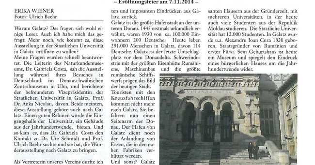 0Universitatea „Dunărea de Jos” din Galaţi a găzduit, în perioada noiembrie-decembrie 2014, expoziţia „Oameni cuvioşi şi harnici… Colonişti germani în Basarabia (1814-1940)”. La aproape o lună de la închiderea expoziţiei, organizatorii nemţi au publicat un amplu articol despre Galaţi în numărul din luna ianuarie al revistei Asociaţiei Germanilor Basarabeni, parteneră în organizarea acestei manifestări.