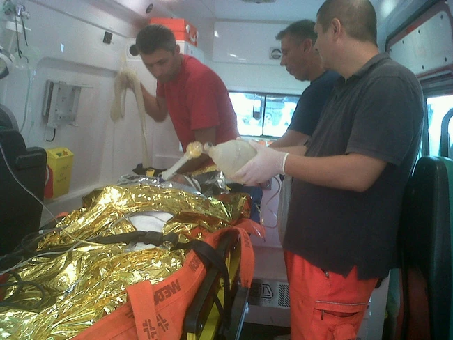 „În ambulanţă, în drum spre spital, victima era conştientă. Suferise arsuri pe cea mai mare parte a corpului şi arsuri ale căilor respiratorii. I-a fost indusă coma artificială şi am obţinut acceptul Spitalului de Arşi din Bucureşti pentru a-l transfera. În acest moment (ora 12.01), pregătim pacientul pentru transportarea acestuia la heliportul din curtea Poliţiei de Frontieră, unde va fi preluat de un elicopter SMURD", ne-a informat dr Angel Trifan, medicul coordonator UPU-SMURD