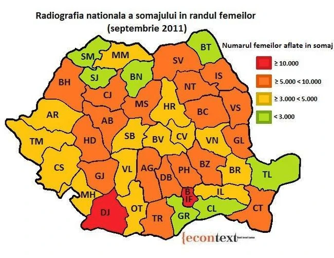 Cel mai afectat judeţ de creşterea şomajului în rândul femeilor este Satu Mare, unde numărul şomerilor s-a dublat în cei trei ani de criză. Este urmat de judeţul Constanţa, cu o creştre de 76,9% a şomajului feminin de la începutul crizei şi până în prezent.