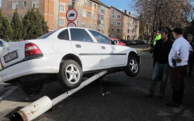 Accident „made in Hunedoara”: un vitezoman s-a urcat cu maşina pe semafor FOTO