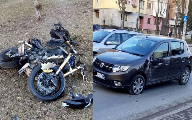 Accident pe un bulevard din municipiu: un tânăr şi-a abandonat motocicleta distrusă de o maşină. Nu avea permis