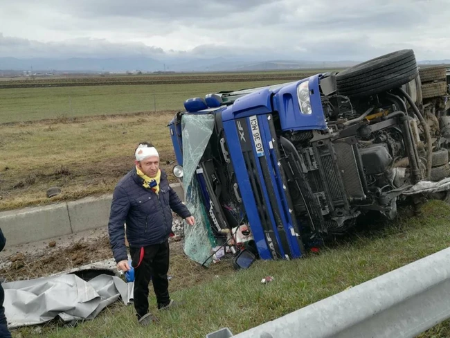 0Un accident rutier s-a petrecut, marţi, pe Autostrada Orăştie - Sibiu. Un autotren s-a răsturnat după ce a lovit un camion care staţiona pe banda de urgenţă.