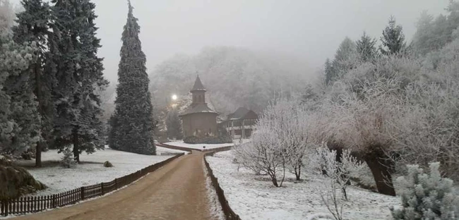 Ninsorile au transformat peisajul Mănăstirii Prislop într-unul feeric. Puţini pelerini au ajuns, în Ajunul Crăciunului, la locul de veci al duhovnicului Arsenie Boca, astfel că liniştea din curtea aşezământului a fost aproape netulburată.