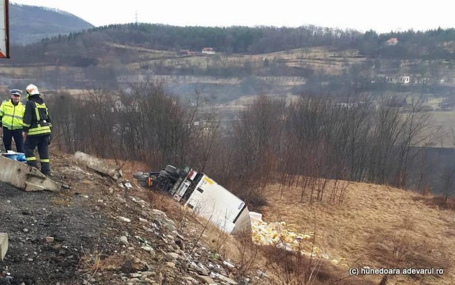 Într-o curbă periculoasă a Dealului Mare, un camion care transporta băuturi carbogazoase pe ruta Brad - Deva, a ieşit în decor, a lovit parapeţii şi apoi s-a răsturnat în afara părţii carosabile.