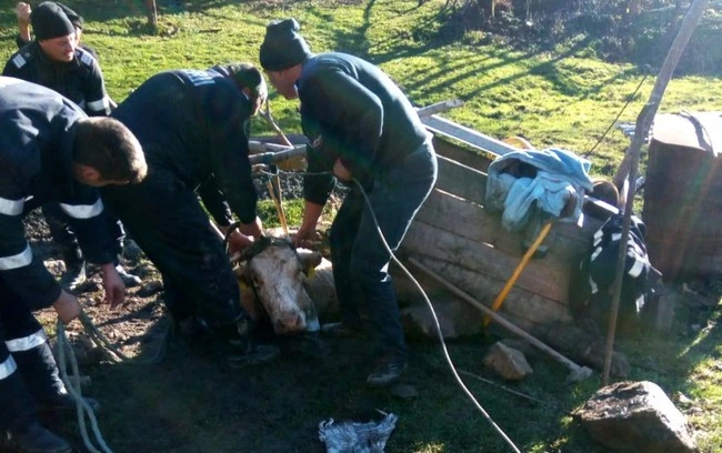 Misiune de salvare inedită a pompierilor. O vacă s-a prăbuşit într-o fântână adâncă de trei metri