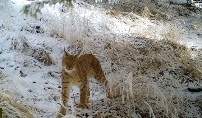 Imagini inedite au fost surprinse într-o pădure din Parcul Național Retezat, de camerele video folosite pentru monitorizarea faunei. În clipul video publicat pe pagina de Facebook a administrației rezervației apare un râs (Lynx lynx) gălăgios.
