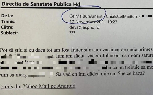 După ce a fost vaccinat împotriva Covid 19, un hunedorean a trimis Direcţiei de Sănătate Publică Hunedoara un mail care i-a lăsat fără replică pe angajaţii instituţiei.