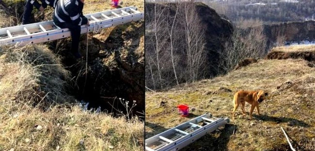 Pompierii au salvat, vineri, de la moarte un câine căzut într-o surpare cu o adâncime de peste peste metri.