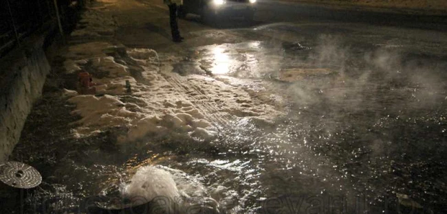 Strada Rotarilor din Hunedoara s-a transformat într-un patinoar imens, în urma unei avarii la reţeaua de apă şi canalizare. O vană de apă din reţeaua subterană a crăpat din cauza gerului, iar la scurt timp canalele au refulat.
