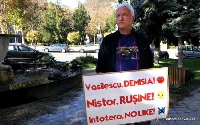 Vladimir Brilinsky, fostul administrator al sitului UNESCO Sarmizegetusa Regia, a declanşat un protest împotriva mai multor oameni politici. Luni, el a manifestat timp de o oră în faţa Consiliului Judeţean Hunedoara, prezentând o pancartă pe care a scris „Vasilescu – demisia, Nistor – ruşine, Intotero – no Like”, cu referire la vicepreşedintele Consiliului Judeţean, Sorin Vasilescu, la preşedintele PSD Hunedoara, Laurenţiu Nistor, şi la ministrul Românilor de pretutindeni, deputata PSD Natalia Intotero.