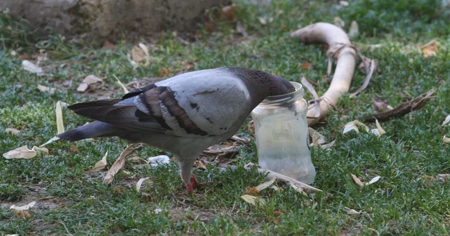 0Un porumbel caută apă într-un borcan gol