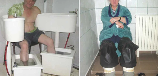 Încolonaţi, aceştia se uită nerăbdători la ceas pentru a vedea când le vine rândul. De cum intri pe uşa bazei comune te izbeşte un miros puternic de plante folosite la ceai. Aici este Secţia de Hidroterapie, unde se calmează durerile cu ajutorul vaporilor de apă fierbinte cu plante. În medie, 16 persoane fac zilnic astfel de băi în mentă.