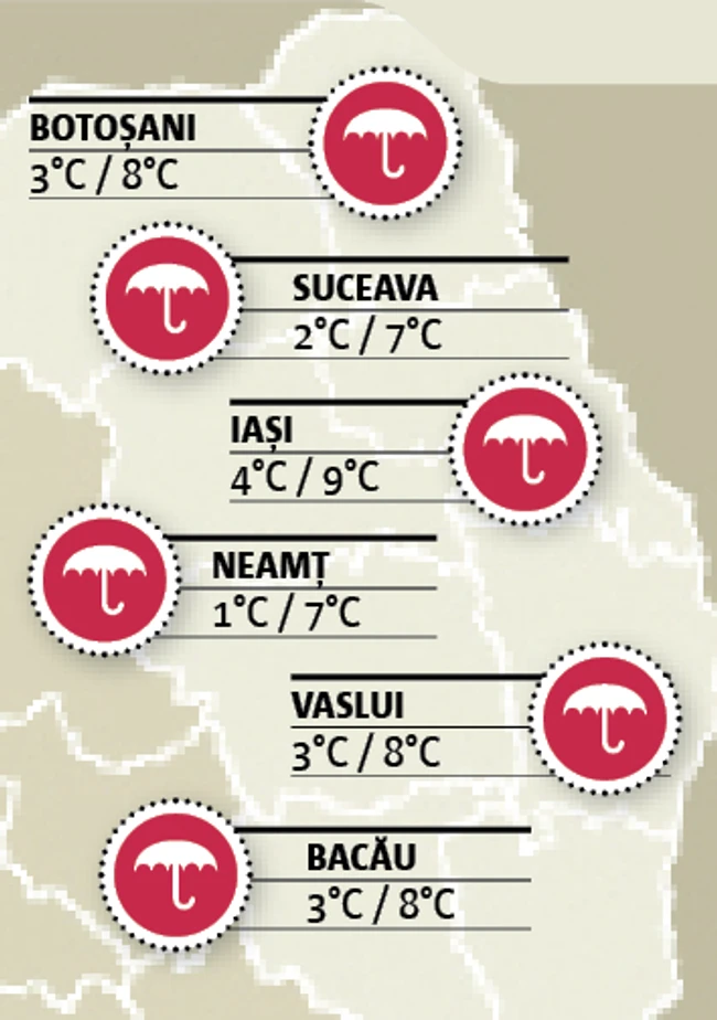 0Meteorologii anunţă vreme ploioasă în toate judeţele din regiunea de nord-est a ţării. Temperaturile maxime nu vor depăşi 9 grade Celsius, în timp ce minimele vor coborî până la 1 grad Celsius în judeţul Neamţ. Vântul va sufla slab până la moderat din sector nord-vestic.