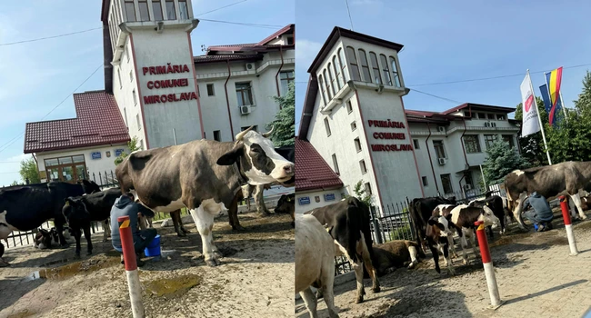 În cursul zilei de azi, 20 mai 2024, un ieșean a ales să își manifeste nemulțumirile într-un mod inedit. Acesta s-a prezentat în fața primăriei comunei Miroslava, la orele dimineții, unde a adus și mai multe vaci, oprindu-se chiar în fața instituției. Aici a stat câteva zeci de minute, timp în care chiar a și muls animalele pe care le are în proprietate.