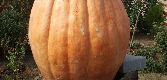 Proprietarul giganticului fruct, care atinge un metru înălţime, spune că a ajuns la această performanţă folosind seminţe aduse din Spania. Motiv de mândrie, dovleacul a fost pus de stăpân pe un piedestal făcut din trunchiul unui copac, pentru a se încadra mai bine în decor.