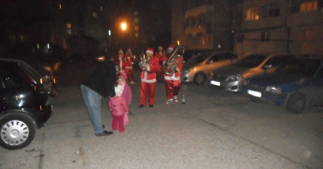 0Şase tineri îmbrăcaţi în cunoscutul costum roşu cu alb al lui Moş Crăciun au colindat ieri noapte cu saxofoane, trompete şi tube cartierul CUG. Aceştia au mers printre blocuri spre deliciul copiilor şi al locatarilor care i-au aplaudat.